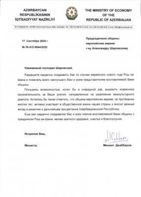 Bir daha Sizi və rəhbərlik etdiyiniz icmanın bütün üzvlərini Roş ha-Şana bayramı münasibətilə ürəkdən təbrik edir, möhkəm cansağlığı, xoşbəxtlik və rifah arzulayıram.