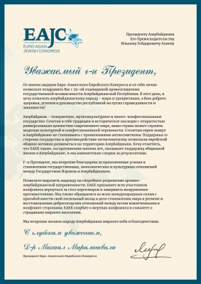 Avrasiya Yəhudi Konqresinin liderləri və şəxsən öz adımdan Sizi Azərbaycan Respublikasının dövlət müstəqilliyinin elan olunmasının 29-cu ildönümü münasibətilə ürəkdən təbrik edirəm. Bu əlamətdar gündə Azərbaycan xalqına sülh və firavanlıq, Sizə isə möhkəm cansağlığı, respublikanı ədalət və qanunçuluq yolu ilə idarə etməkdə uğurlar arzu edirəm!