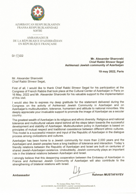 2022-ci il mayın 16-da Fransanın paytaxtı Parisdə Fransa Ravvinləri Konqresi keçirilib. Konqresin iclasları Parisdə yerləşən Azərbaycan Mədəniyyət Mərkəzinin binasında baş tutub.