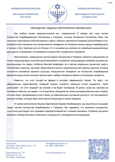 Azərbaycan Avropa Yəhudiləri Dini İcması adından, Tehranda Azərbaycan səfirliyinə qarşı törədilmiş terror aktını qətiyyətlə pisləyirik. Ümid edirik ki, İran dövləti bu qanlı terror hadisəsini hərtərəfli araşdıracaq və günahkarları cəzalandıracaq. Xüsusilə, beynəlxalq ictimaiyyət üçün bu araşdırmanın şəffaf aparılması olduqca vacibdir.