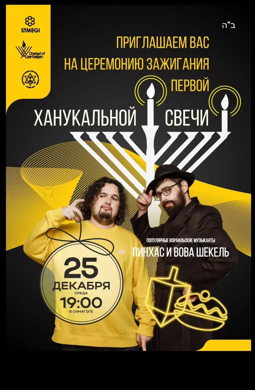 Sizi 25 dekabr saat 19:00-da Aşkenaz yəhudiləri sinaqoqunda 5784-cü ilin ilk Xanuka şamının yandırılmasına dəvət edirik. Bundan əlavə, sizi məşhur duet – PİNXAS və VOVA ŞEKELin iştirakı ilə keçiriləcək bayram konserti gözləyir.