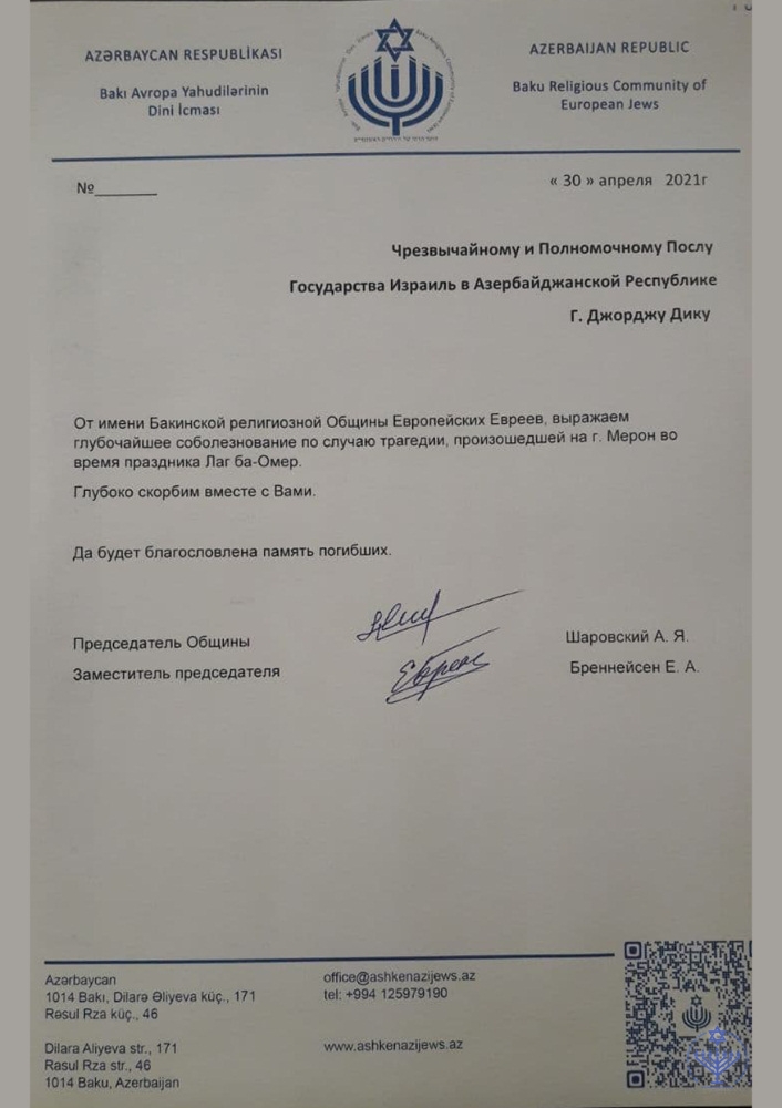 Bakı Avropa Yəhudiləri Dini İcması adından Meron dağında Laq ba-Omer bayramı zamanı baş vermiş faciə ilə bağlı dərin hüznlə başsağlığı veririk. Sizinlə birlikdə dərindən kədərlənirik.
