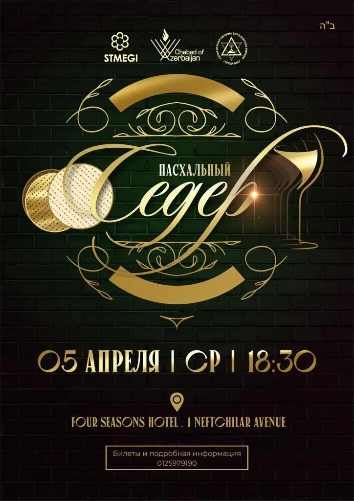 Pasxa sederi – yəhudi ilinin ən təntənəli və əhəmiyyətli hadisələrindən biridir. Bu axşam biz əcdadlarımızın Misirdəki köləlikdən çıxışını xatırlayır və Qurtuluşumuzu bir çox ayin və göstərişlərlə qeyd edirik. Bu il sizi Bakının dəbdəbəli Four Seasons otelində keçiriləcək bayram süfrəsinə qoşulmağa dəvət edirik ki, tariximizin bu möhtəşəm məqamını birlikdə yaşayaraq yad edək.